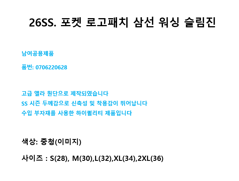 26SS. 포켓 로고패치 삼선 워싱 슬림진