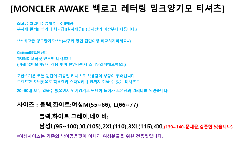 MONCLER AWAKE 백로고 레터링 밍크양기모 티셔츠/빅사이즈까